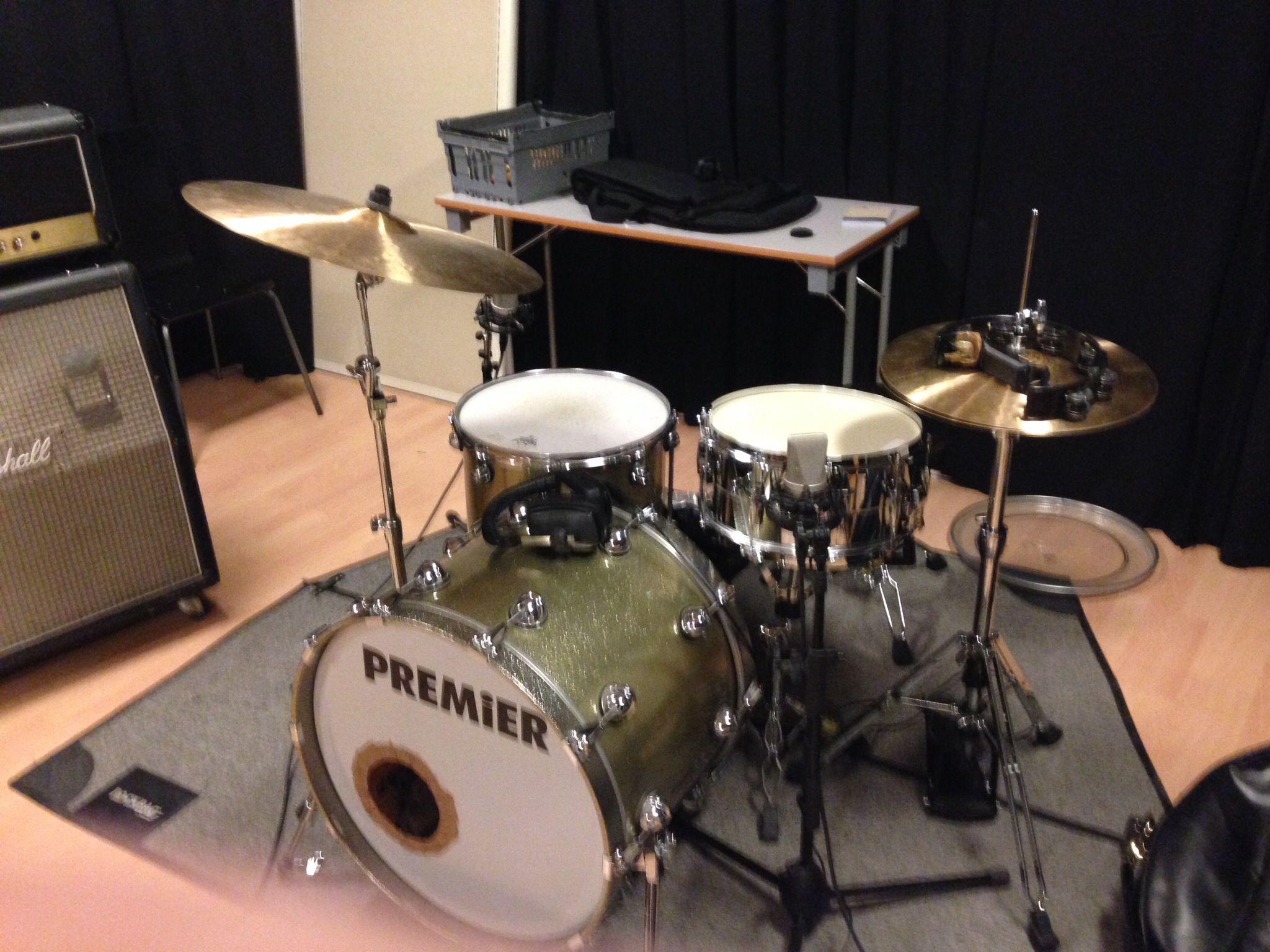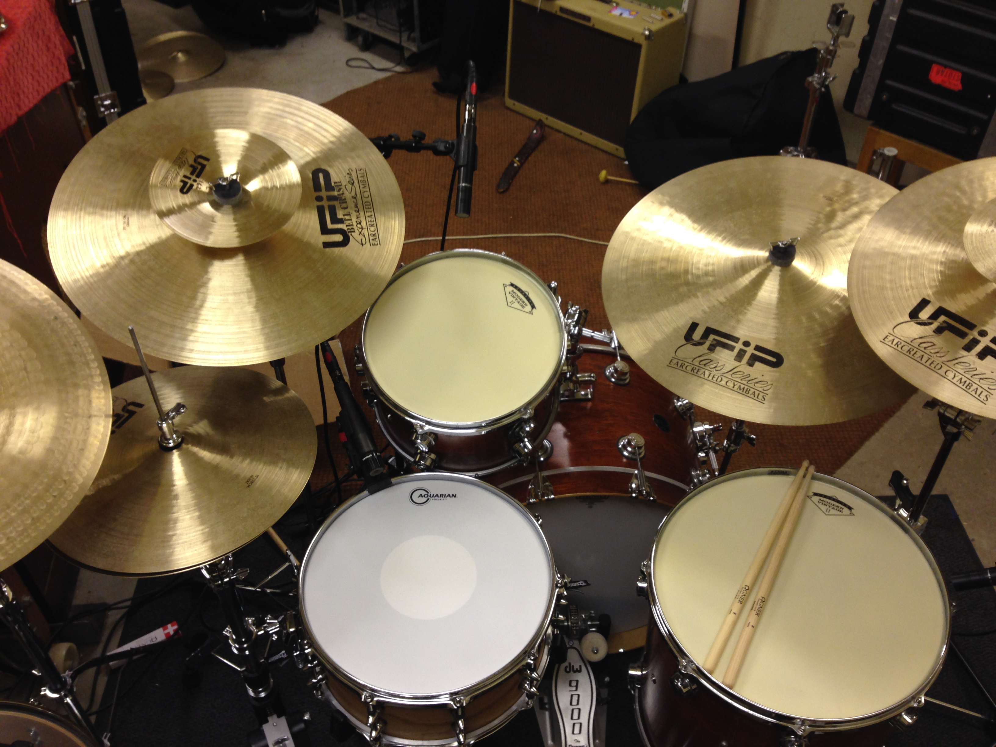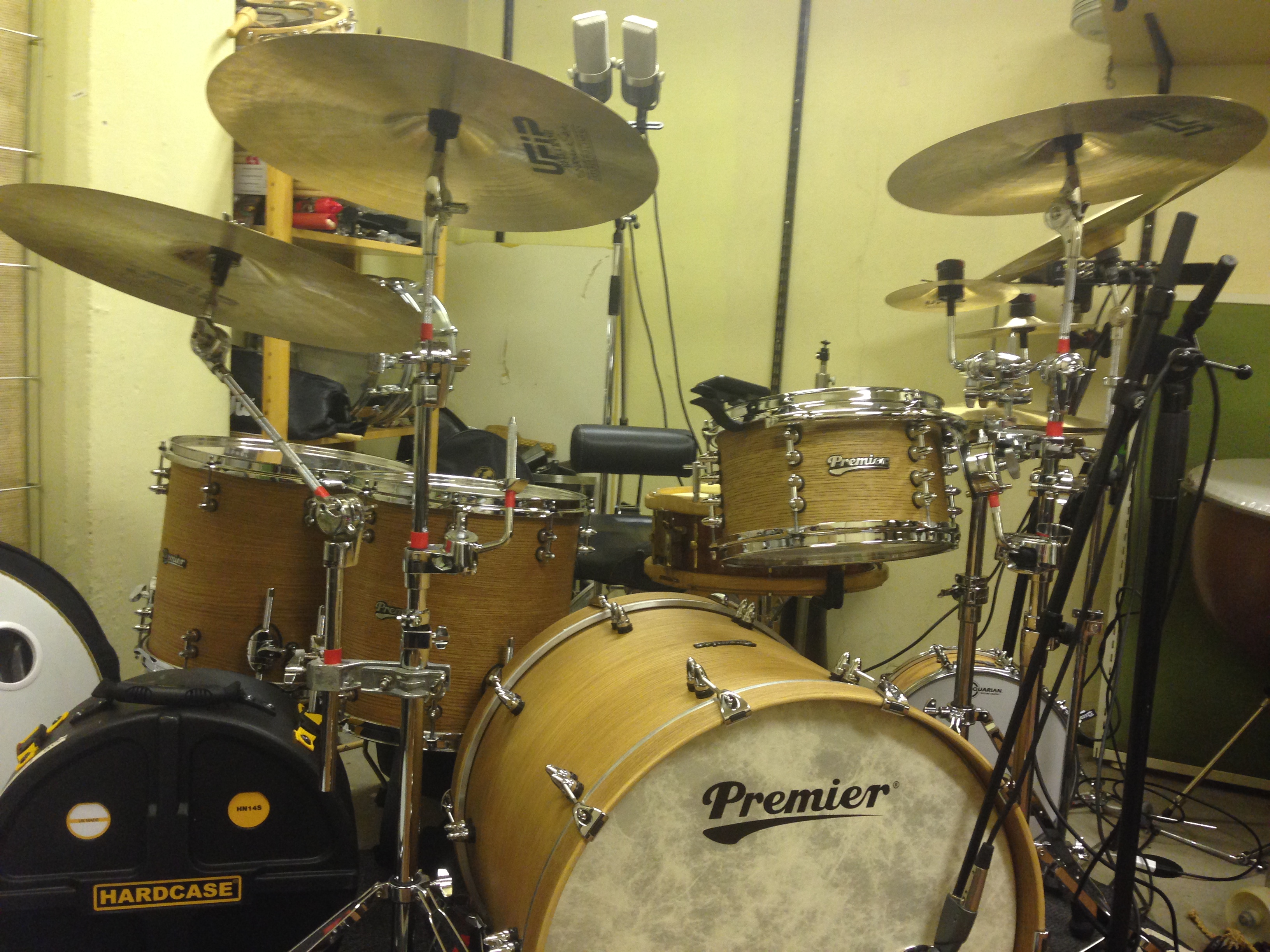 Grunden är alltid mitt Premier Spitfire samt Ufips cymbaler. Detta är mina absoluta favoriter som passar nästan alltid oavestt genre. Premier gör trummor av mycket högkvalitet som är enkla att stämma och jag får snabbt till det ljud jag behöver. Samma sak gäller för Ufip, extremt bra cymbaler som håller och som har mycket dynamik. Cymbaler gillar jag genrellt ljusa och har då flest av från Ufips Class series, tänk A Zildjian så vet ni vad jag menar. Så väl trummor som cymbaler låter helt enkelt bara bra!